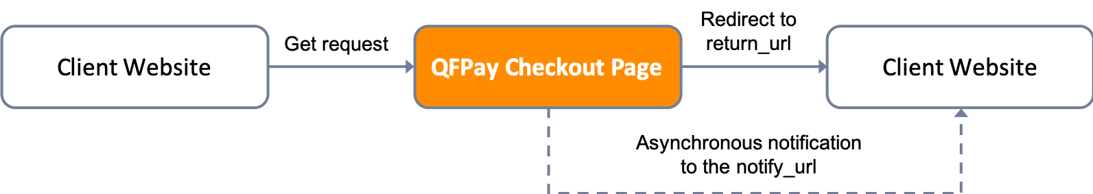 使用者於商戶網站選擇付款,點擊「付款」後將跳轉至 QFPay 託管結帳頁面,選擇錢包並完成付款流程。完成後將跳轉回商戶網站顯示付款結果。